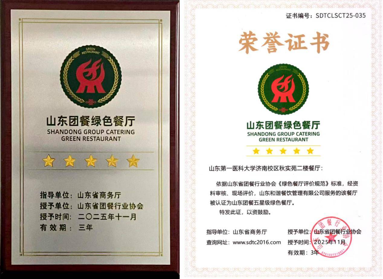 近日,山东省团餐行业协会正式公布2025年山东省团餐行业质量提升工程“绿色餐厅”名单,校(院)秋实苑二楼餐厅经严格评审斩获五星级“绿色餐厅”殊荣。作为该评定体系中的最高星级,五星级代表着餐厅在绿色发展领域的顶尖水平,此次荣誉标志着学校餐饮服务跻身全省高校团餐绿色发展第一梯队。